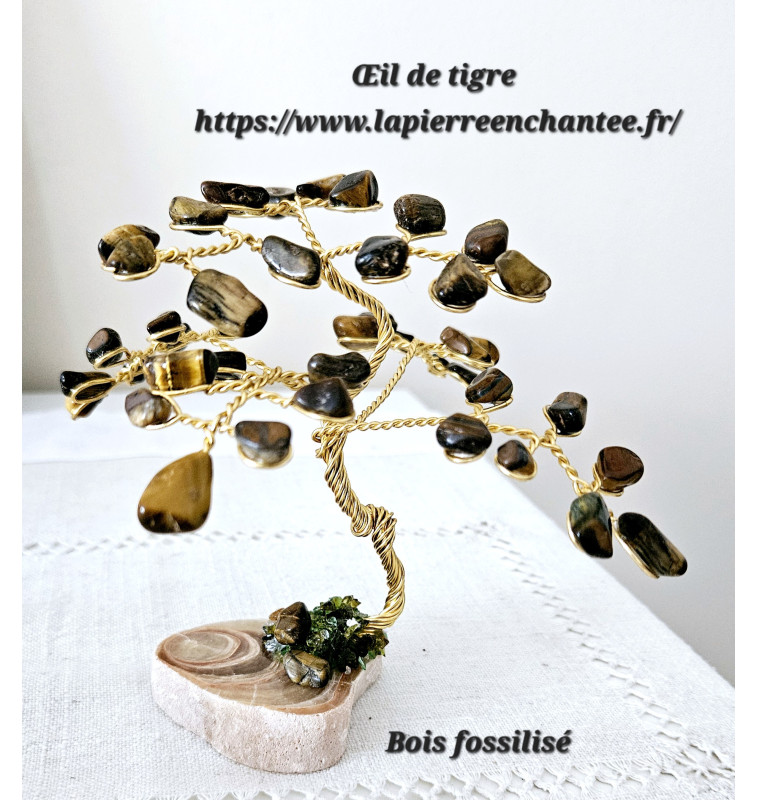 Arbre de vie en Œil de tigre et Bois fossilisé, deux minéraux utilisés en lithothérapie pour favoriser le bien-être, la protection, l'ancrage et la paix intérieure.
