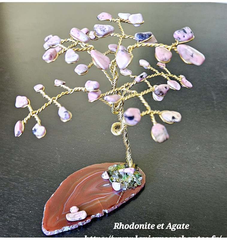 Arbre de vie en Rhodonite sur une belle tranche d'Agate , deux minéraux réputés en lithothérapie pour favoriser le bien-être, la sérénité, la douceur, et pour aider à lutter contre le stress .