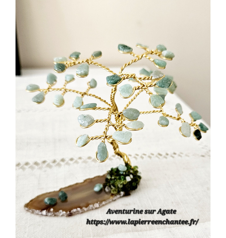 Arbre de vie en Aventurine sur tranche d'agate naturelle.