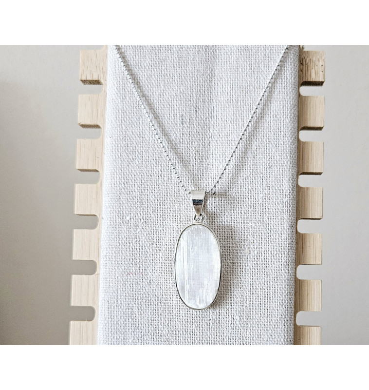 Pendentif en Sélénite, finitions en métal argenté hypoallergénique.