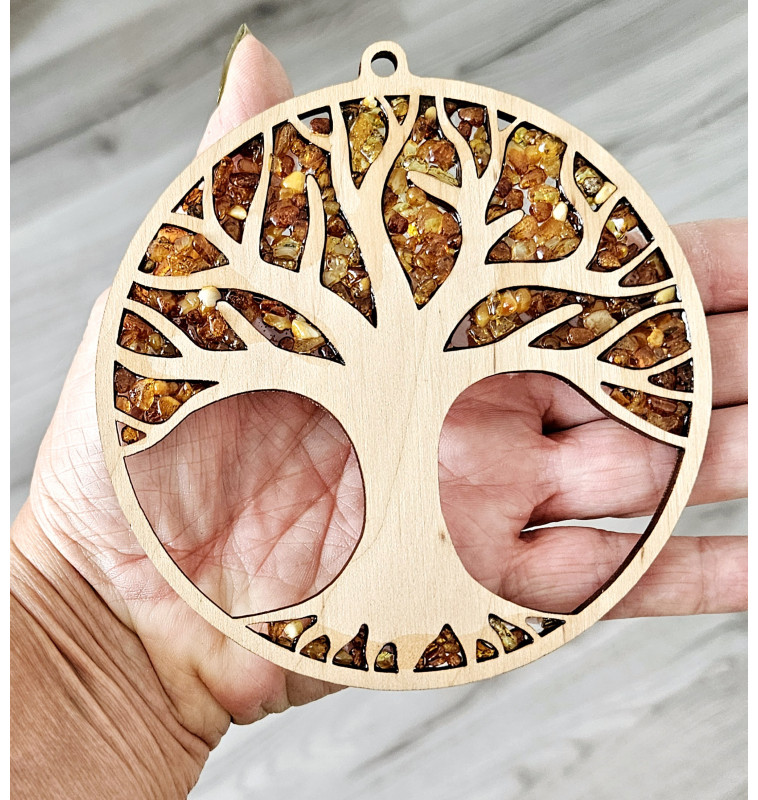 Arbre de vie en Ambre de la Baltique, à suspendre ou à aimanter, bois de bouleau, diamètre 11 cm .