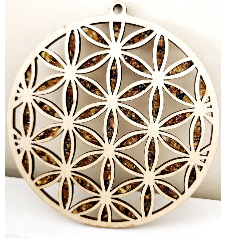 Fleur de vie en Ambre de la Baltique, bois de bouleau, à suspendre ou à aimanter, dimensions 11 cm .