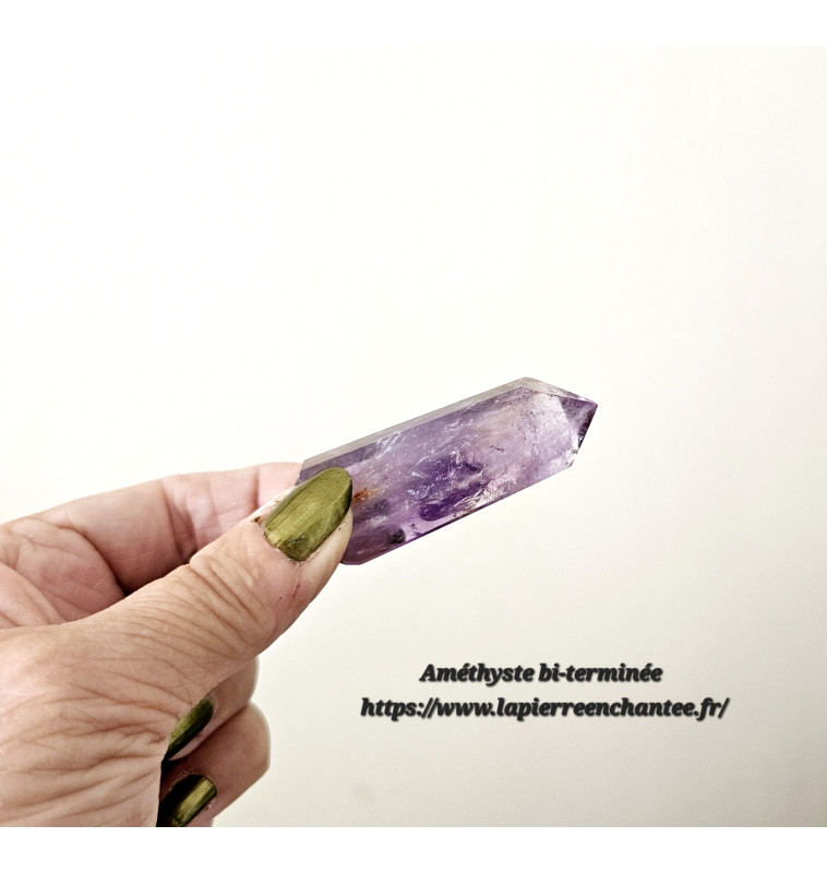 **Utilisation** : En lithothérapie, l’améthyste bi-terminée est utilisée pour canaliser et équilibrer les énergies. Elle peut être placée dans un espace de méditation ou portée comme bijou.