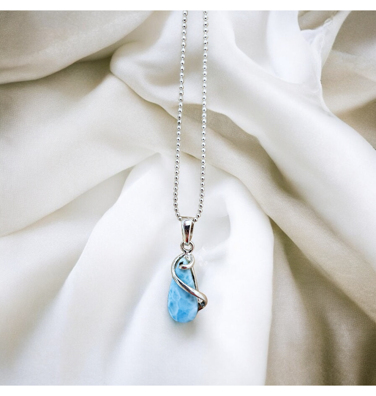 Le pendentif en Larimar, avec un sertissage en argent 925, est un bijou d'exception mettant en valeur une pierre naturelle rare originaire de la République Dominicaine. Apprécié pour sa teinte bleue unique évoquant les eaux tropicales, le Larimar est très prisé en lithothérapie pour ses vertus énergétiques et apaisantes.