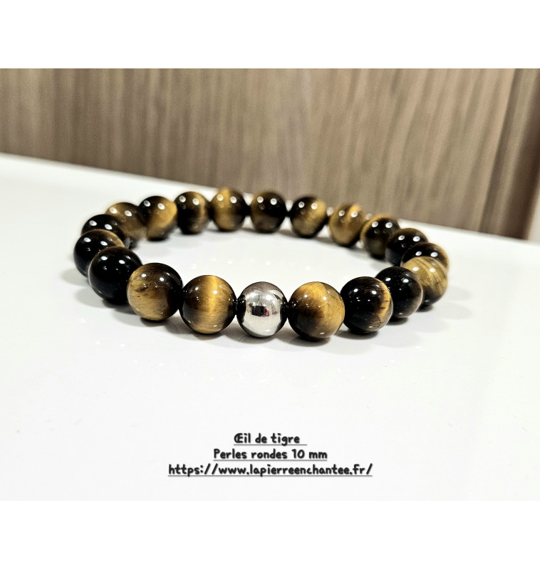 Bracelet pour homme en Œil de Tigre qualité AA , perles rondes 10 mm , finitions argentées.