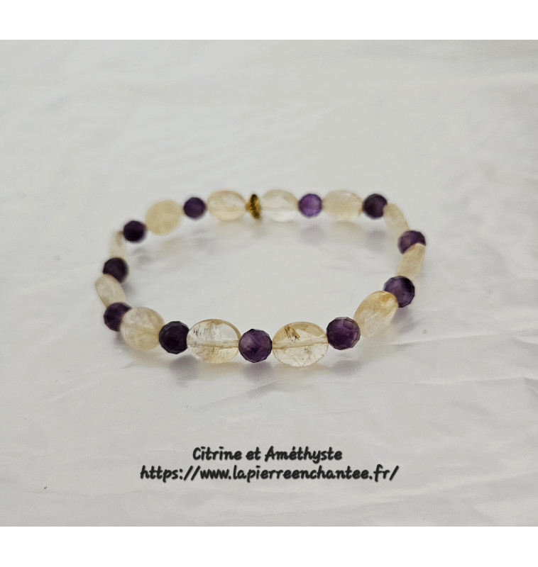 Bracelet en Citrine et Améthyste, bijou bien-être aux finitions dorées.