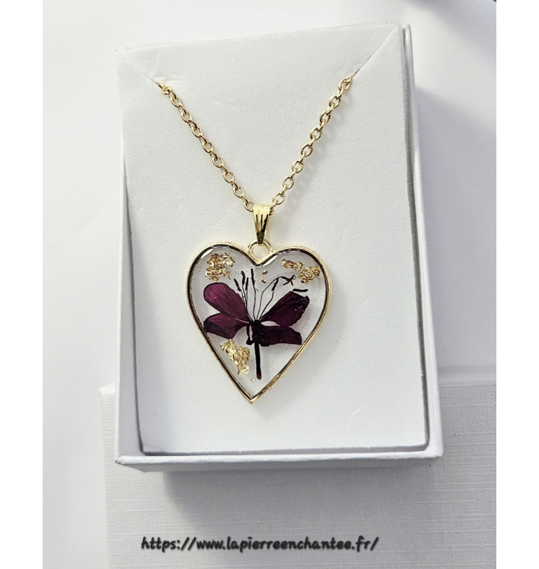 Collier cœur bohème en résine et fleurs séchées de gaura rouge