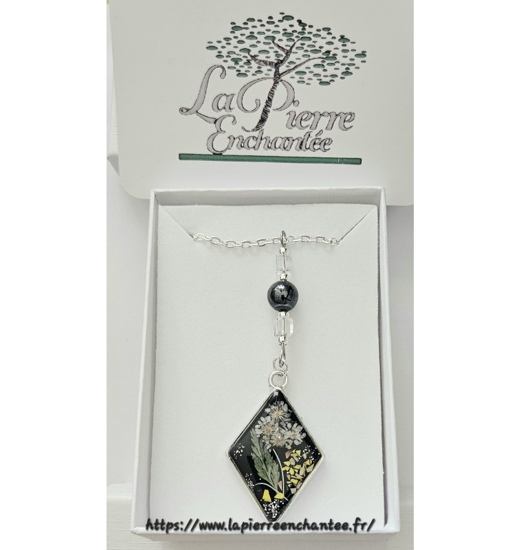 Pendentif en résine forme losange , fleurs blanches et jaunes, Cristal de roche et Hématite