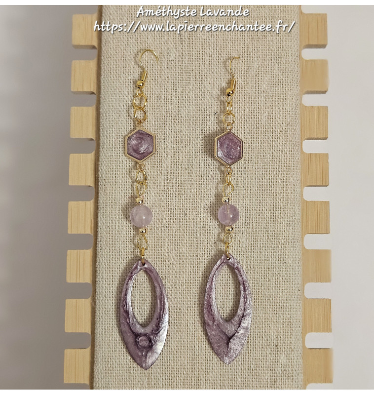 Boucles d’oreilles dorées et Améthyste Lavande – Résine, création artisanale .