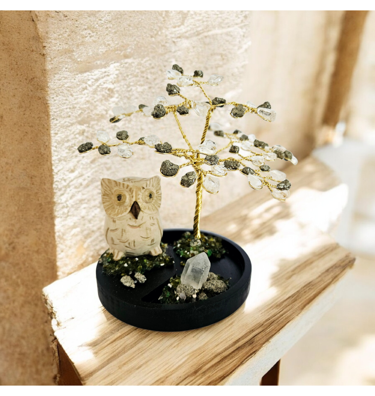 Une petite chouette en bois aux grands yeux, symbole de connaissance et d’intuition, veille près de l’arbre comme un guide discret, protecteur et bienveillant.