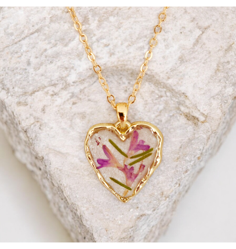 Offrez-vous un fragment de nature à porter au quotidien avec ce pendentif cœur, entièrement réalisé à la main dans notre atelier. Cette création artisanale est bien plus qu'un simple bijou : c'est une œuvre miniature qui emprisonne la beauté éphémère des fleurs.