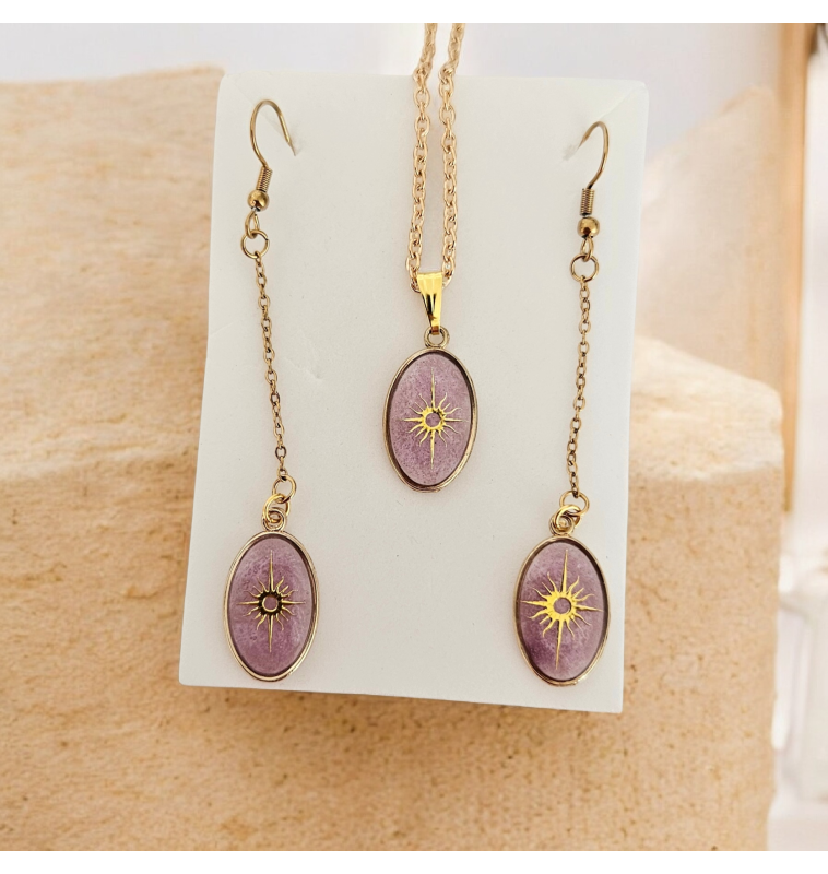 Ensemble élégant en résine mauve rosé, orné d’une étoile céleste. Pendentif ovale doré avec chaîne assortie et boucles d’oreilles longues harmonieuses.