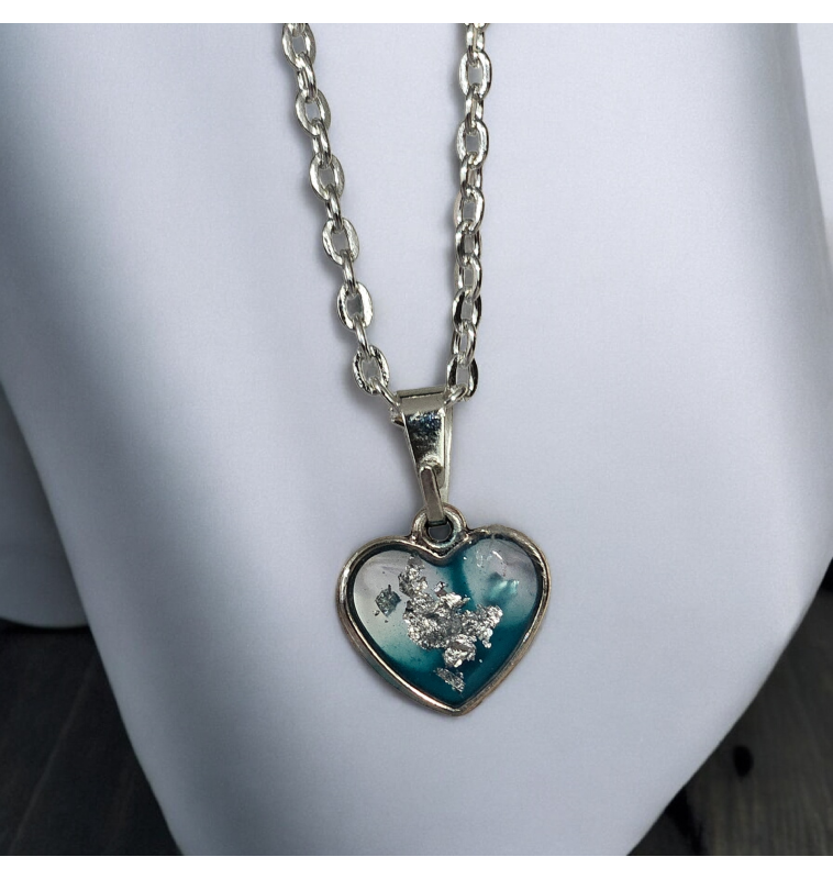 Pendentif en forme de petit cœur (1,5 × 1 cm) en résine vitrail bleu gris, délicatement parsemé de feuilles d’argent. Chaîne argentée incluse. Bijou artisanal lumineux et apaisant.