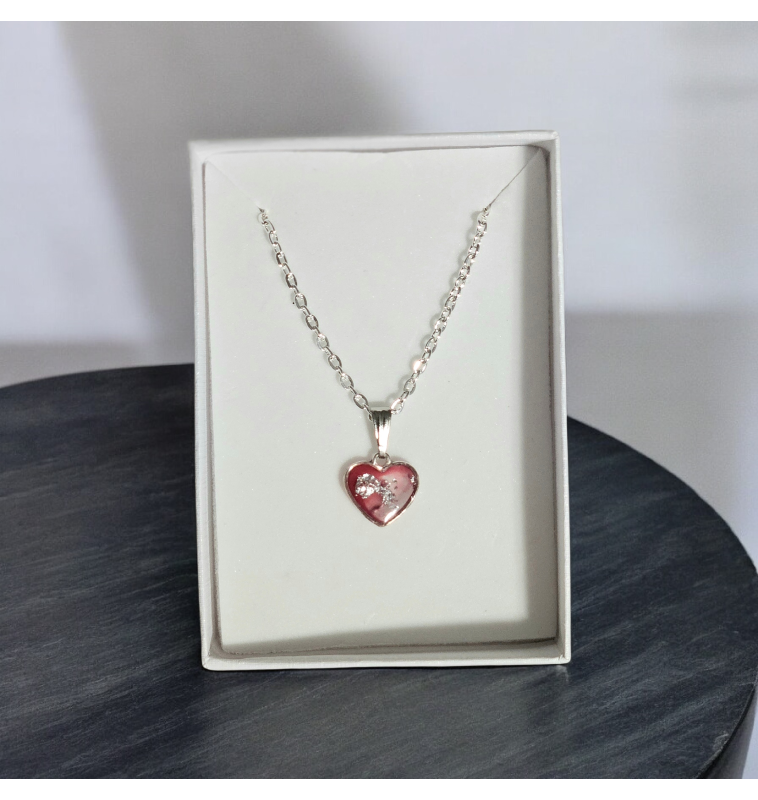 Pendentif en forme de cœur en résine vitrail vieux rose, sublimé par des inclusions de feuilles d’argent. Finitions et chaîne argentées incluses. Bijou artisanal doux et lumineux.