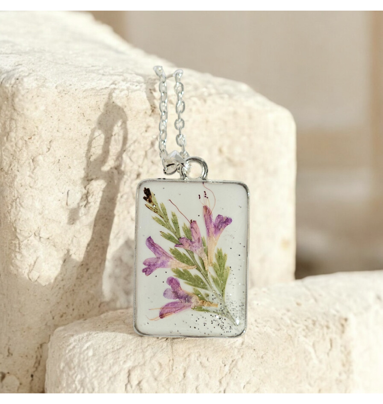 Comme un éclat de printemps suspendu dans la lumière, ce pendentif rectangulaire révèle toute la délicatesse de fleurs séchées naturelles mauves sur un fond blanc éclatant, sublimé par de discrètes paillettes argentées.
