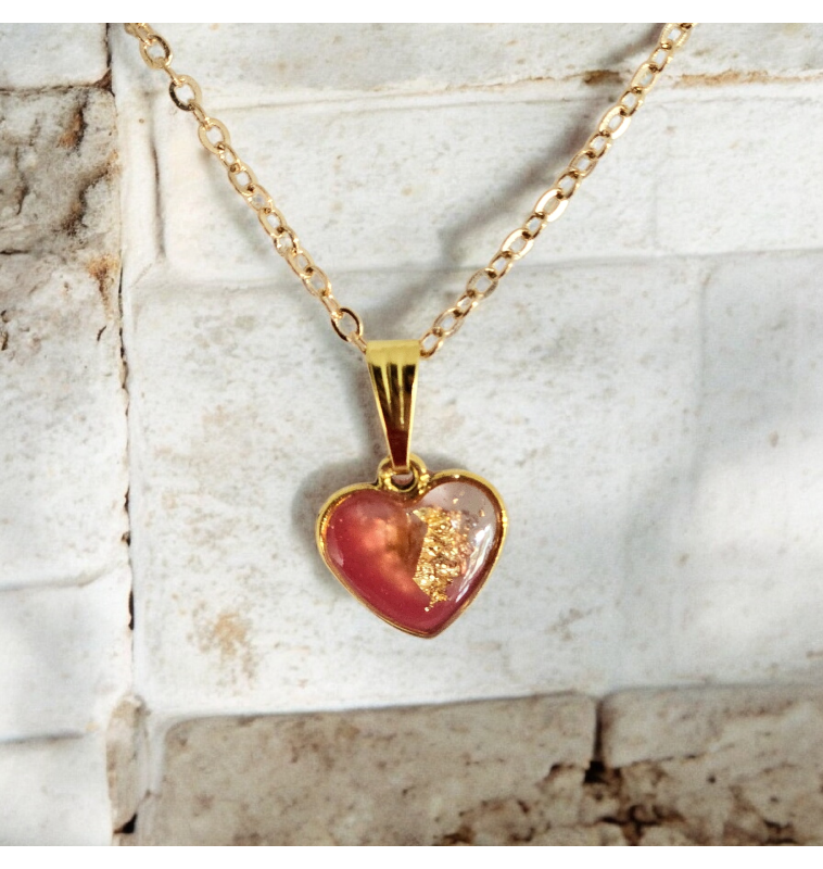 Pendentif en forme de cœur en résine façon vitrail, couleurs vieux rose, avec inclusions de feuille d’or. Finitions et chaîne dorées incluses. Bijou artisanal lumineux et raffiné.