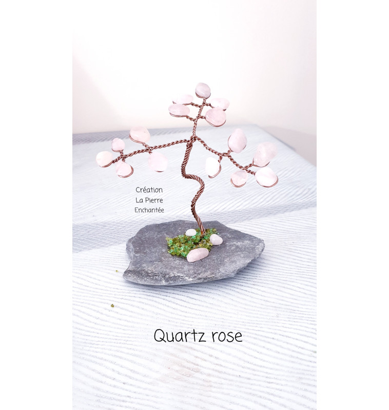 Arbre de vie en Quartz rose sur un galet naturel.