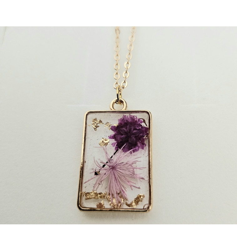 Élégant et raffiné, ce pendentif rectangulaire (3 × 2 cm) capture la délicatesse de fleurs séchées naturelles teintées de rose, associées à de fines feuilles dorées.