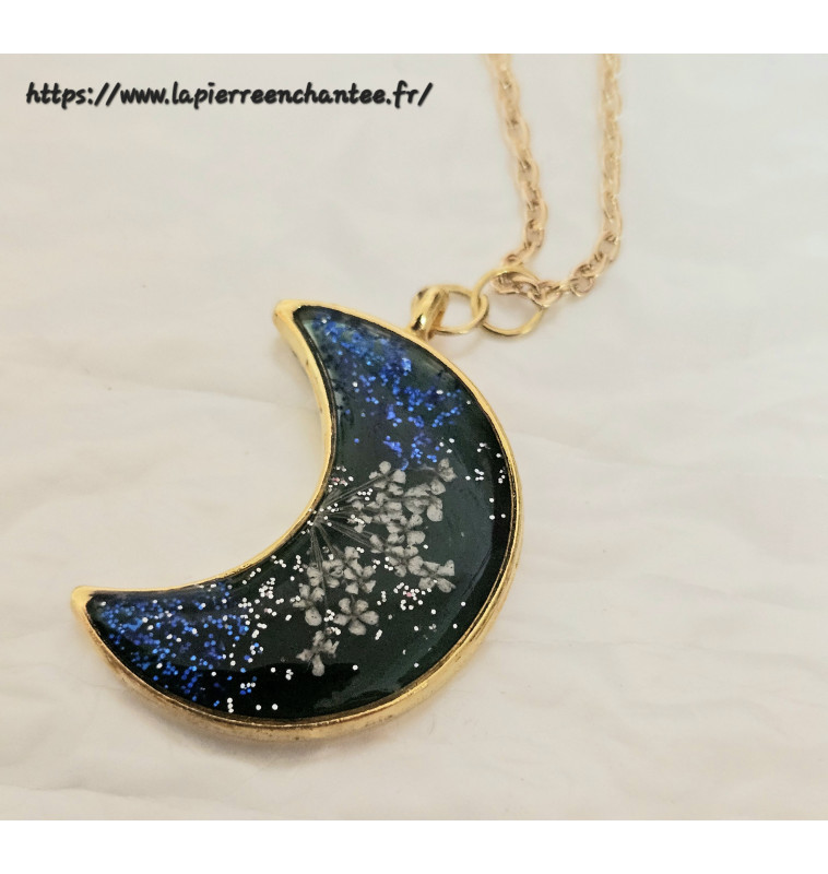 Pendentif en résine cristal , lune bleu nuit, paillettes et fleur séchée – Chaîne dorée incluse