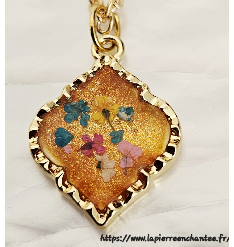 Bijou élégant en résine et fleurs séchées – Chaîne dorée hypoallergénique.