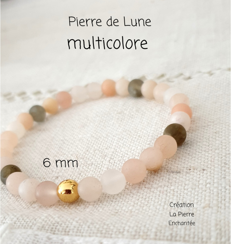 Bracelet en Pierre de Lune multicolore, perles rondes, mates , en 6 mm , finitions dorées.