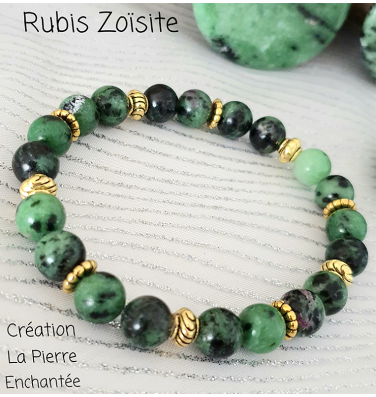 Rubis Zoïsite, bracelet 8 mm , finitions dorées.