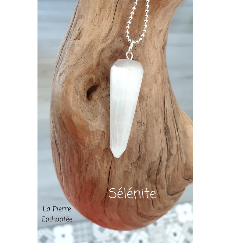 Sélénite pendentif forme pendule, pierre qui éloigne les énergies négatives et les mauvais esprits.