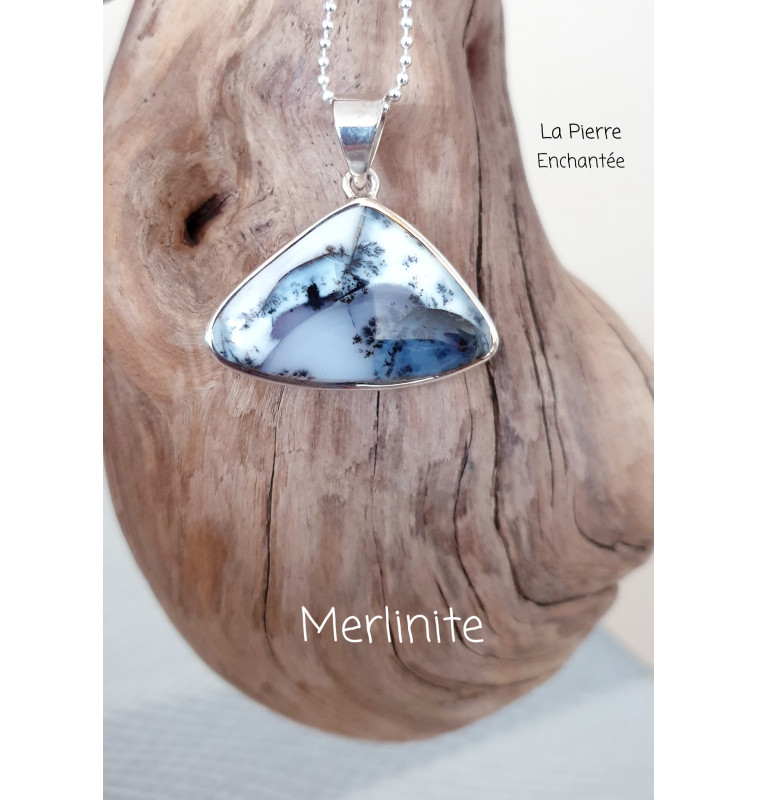 Pierre principale : Merlinite (opale dendritique), connue pour ses motifs uniques évoquant des paysages naturels ou des ramures d’arbres.