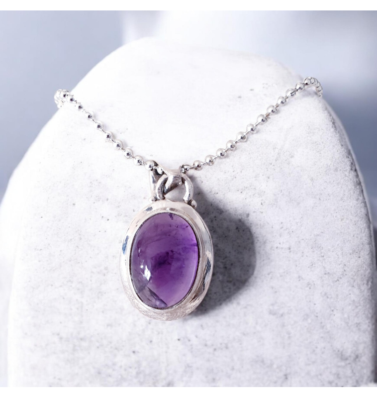 Pendentif en Améthyste naturelle serti argent 925, pierre apaisante favorisant méditation, intuition, sérénité et équilibre émotionnel.